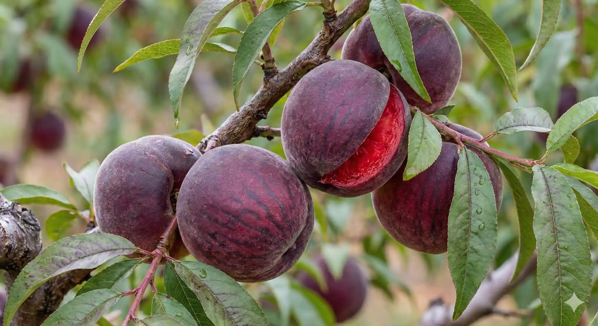 - Fruits : pêches à peau rougeâtre à violacée, chair rouge rubis, juteuse, sucrée et fondante