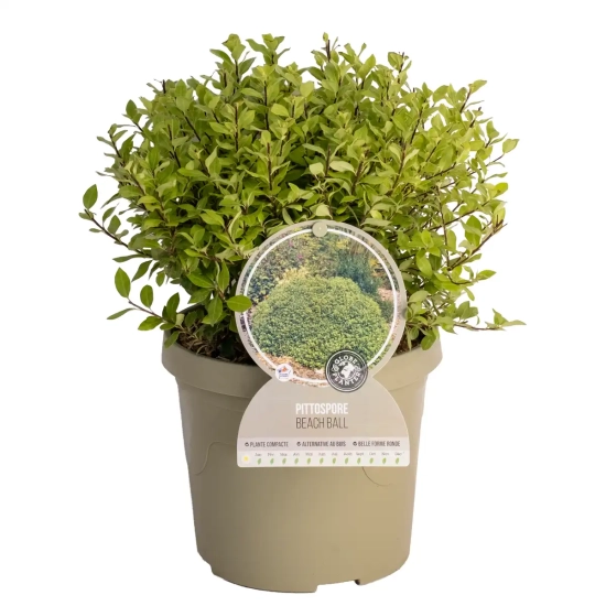 Le Pittospore 'Beach Ball' s'intègre parfaitement dans les massifs décoratifs, en haie basse ou en pot sur une terrasse ensoleillée. Il est également approprié pour les jardins tropicaux et les bordures de chemin. En le combinant avec des plantes comme le Pittosporum Mont Ventoux Pittosporum Tobira Mont Ventoux et le Pittospore Bannow Bay Pittosporum Tenuifolium Bannow Bay, vous créerez un décor cohérent au fil des saisons.