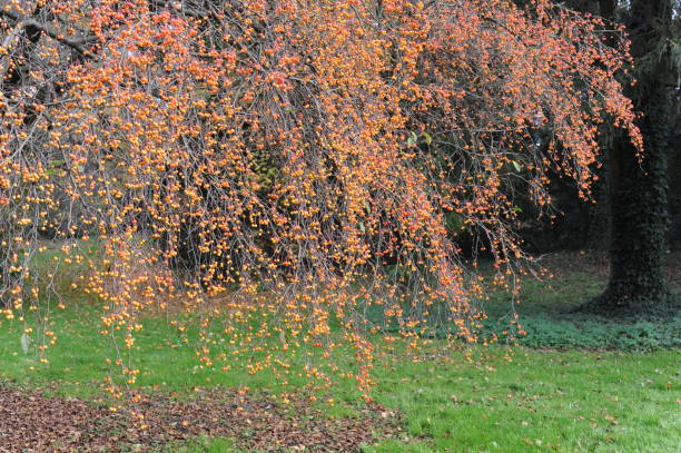Après la floraison, le Pommier d'ornement 'Professor sprenger' se pare de petits fruits décoratifs qui sont souvent colorés en rouge ou en jaune. Bien que ces fruits ne soient pas comestibles, ils ajoutent une valeur ornementale considérable au pommier. En automne, le feuillage devient doré et flamboyant, créant un contraste saisissant avec les fruits qui persistent encore sur l'arbre. Ce cycle annuel de floraison, de fructification et de changement de couleur fait du Pommier d'ornement 'Professor sprenger' une plante particulièrement dynamique qui change au fil des saisons.
