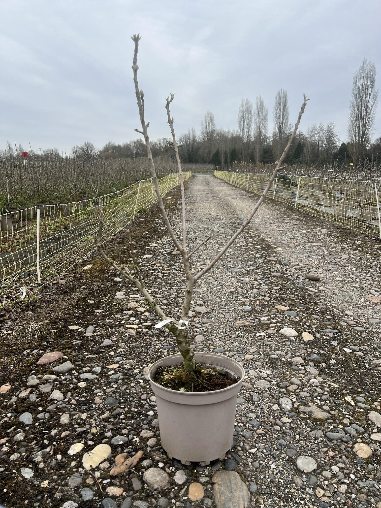 Le tuteurage est vivement recommandé les premières années : installez un tuteur solide (piquet en bois ou en métal) du côté du vent dominant et attachez le tronc avec un lien souple. Conservez ce tuteur pendant 2 à 3 ans, le temps que l’arbre s’enracine correctement.
