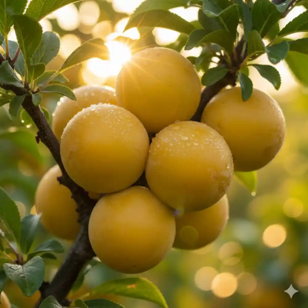Le prunier nain ‘Reine gold’ (Prunus domestica ‘Reine gold’) est un petit arbre fruitier très productif, parfait pour les petits jardins, les terrasses et les vergers familiaux. Compact, décoratif et facile à cultiver, il offre en fin d’été une belle récolte de prunes jaunes, sucrées et légèrement acidulées, idéales à croquer ou à cuisiner. Il résiste jusqu’à -15 °C et s’adapte bien à de nombreuses régions tempérées, ce qui en fait un excellent représentant des pruniers de jardin.