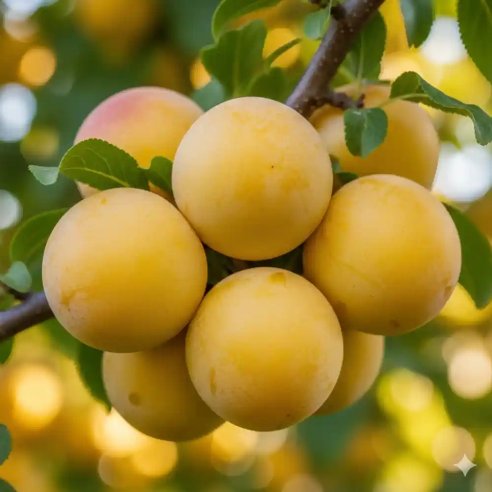 - Fruits : prunes d’abord vertes, devenant dorées à maturité, à chair juteuse, sucrée et parfumée
