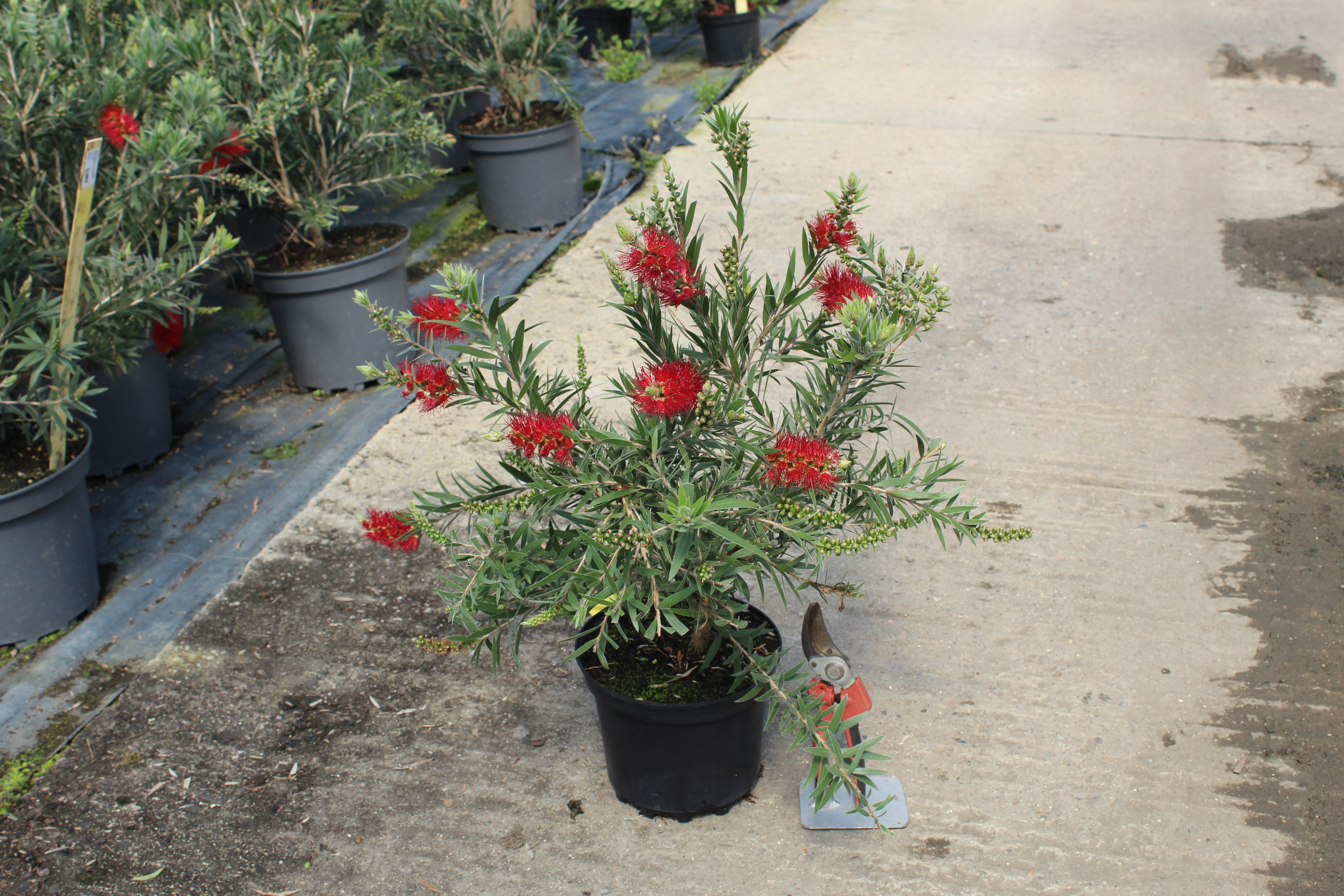 Originaire d'Australie, le CALLISTEMON masotti Mini red appartient à la famille des Myrtacées. Cette plante se distingue par sa taille compacte, mesurant généralement entre 60 et 90 cm de hauteur, avec une silhouette dense et buissonnante. Ses feuilles allongées, d'un vert foncé, offrent un beau contraste avec ses inflorescences flamboyantes. Les fleurs, en grappes serrées et cylindriques, apparaissent entre le printemps et l’été, apportant une touche vibrante et originale au jardin.