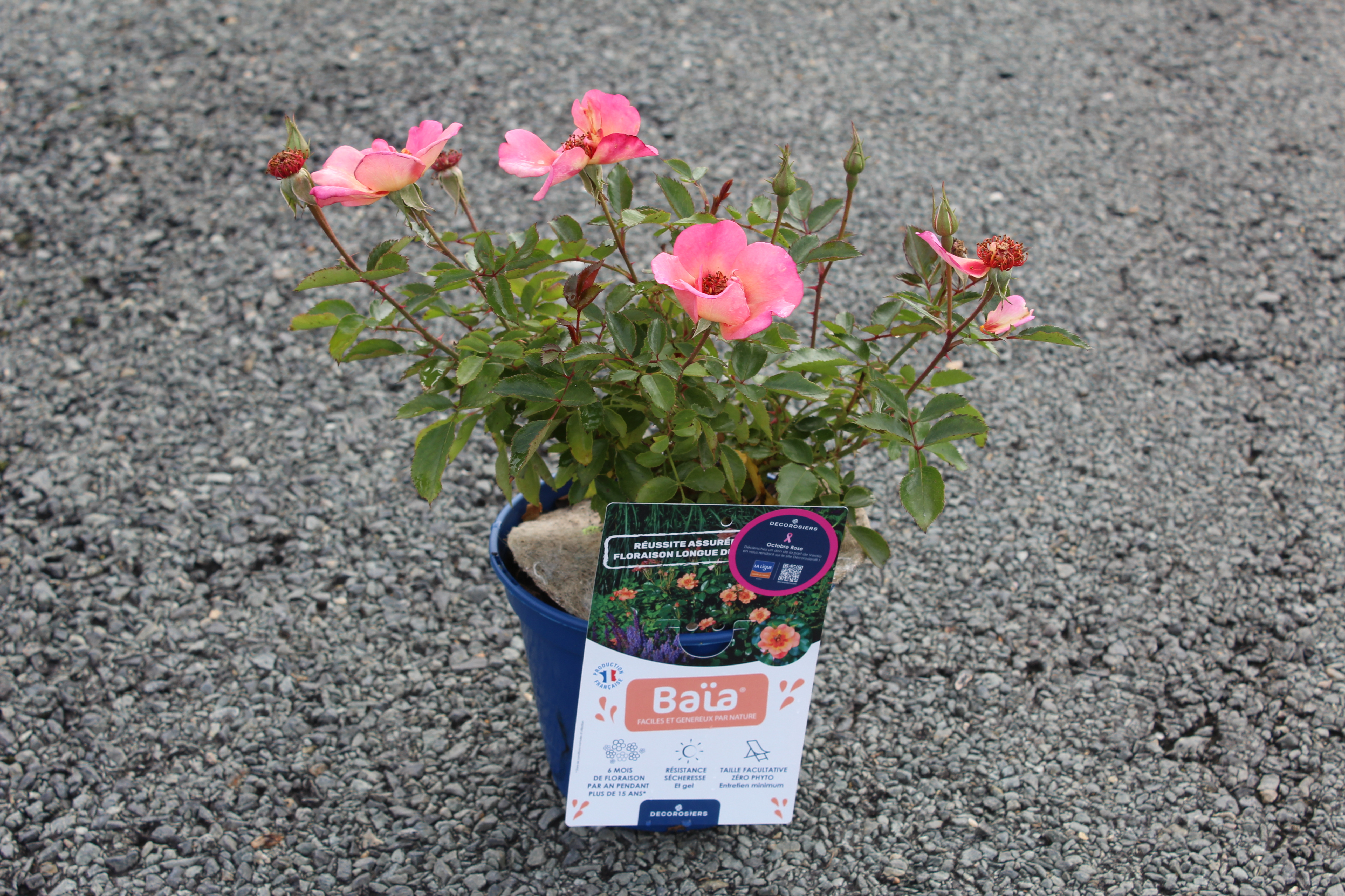 Le Rosier 'Baia' (Rosa 'Baia') est un rosier paysager de la gamme Décorosiers, apprécié pour son port couvrant et sa floraison très remontante de mai à octobre. Si vous cherchez d’autres variétés du même esprit, retrouvez notre sélection de rosiers buissons faciles à vivre. Ses petites fleurs semi-doubles mêlent des tons orange, pêche et rose, souvent avec un cœur plus soutenu, et la plante se montre naturellement résistante aux maladies.