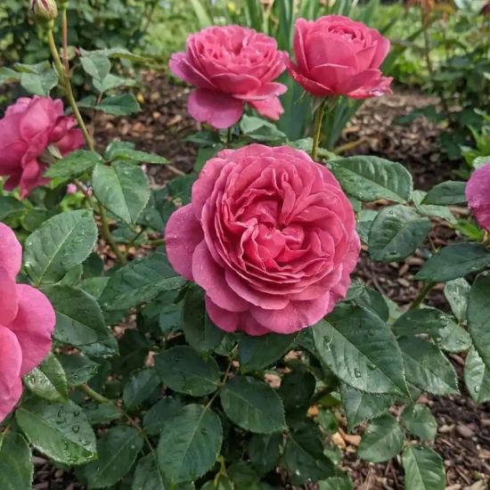 Le Rosier 'Lalande de pomerol ' est une plante qui attire autant par sa beauté que par son parfum envoûtant. Ce rosier est particulièrement apprécié pour ses grandes fleurs pleines, qui se distinguent par leur couleur rose intense et leur port élégant. Ce rosier offre une floraison abondante tout au long de la saison, ajoutant une touche de fraîcheur et de couleur au jardin. Le feuillage vert foncé, brillant et sain, encadre les fleurs d'une manière qui met en valeur chaque bouton en train de s’ouvrir, créant un contraste très agréable.