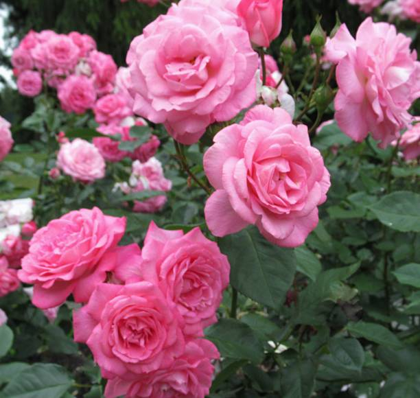 Ce rosier compact et résistant affiche une hauteur d'environ 80 à 100 centimètres et une largeur similaire. Son port buissonnant permet de le cultiver facilement dans des massifs ou en bordure de chemin. Les feuilles sont d'un vert foncé, luisantes et saines, permettant aux fleurs de se détacher délicatement sur fond de feuillage, créant une harmonie visuelle dans le jardin. Ce rosier est également connu pour sa bonne résistance aux maladies, notamment aux conditions climatiques variées, ce qui en fait un choix idéal pour les jardins nécessitant peu d'entretien.