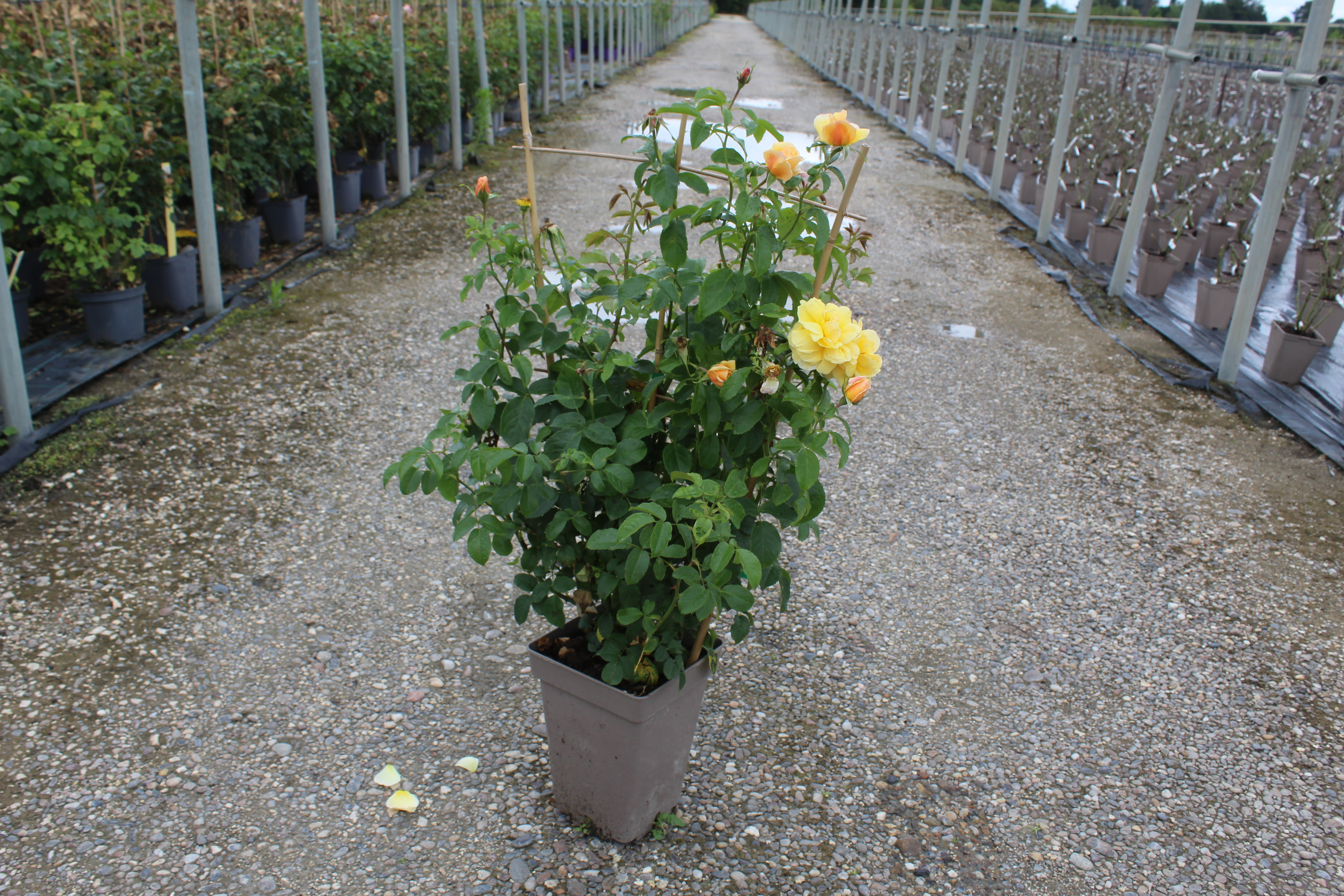 Le Rosier 'Soleil vertical' est une variété de rosier qui se distingue par sa floraison abondante et ses couleurs vives. Ce rosier, très apprécié des jardiniers, est connu pour sa richesse en fleurs jaune d'or qui illuminent n'importe quel espace extérieur. Sa floraison débute généralement au printemps et se prolonge jusqu'à l'automne, offrant ainsi une explosion de couleur pendant plusieurs mois. La floraison est décorative et généreuse, ce qui fait de ce rosier un atout majeur dans la conception paysagère.