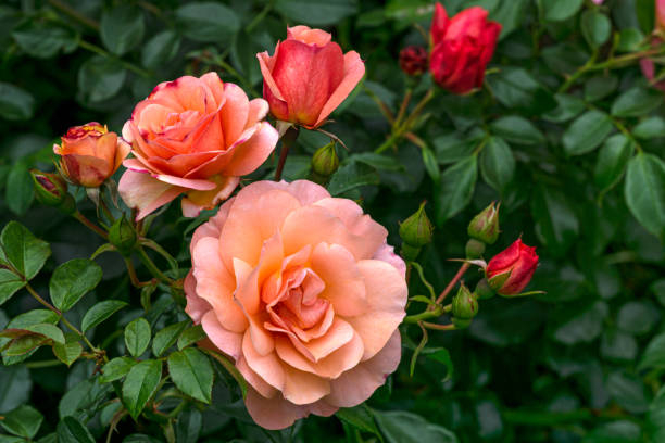 Ce rosier se distingue non seulement par ses fleurs, mais aussi par sa croissance vigoureuse et sa stature élégante. Il peut atteindre une hauteur d'environ 80 à 100 centimètres, ce qui en fait une excellente option pour les bordures, les massifs ou même en pot sur une terrasse. Le feuillage est d'un vert profond, brillant, créant un contraste saisissant avec les fleurs délicates. Ce feuillage est également résistant aux maladies, ce qui facilite l'entretien du Rosier 'Summer of love' et contribue à sa popularité auprès des jardiniers, qu'ils soient débutants ou expérimentés.