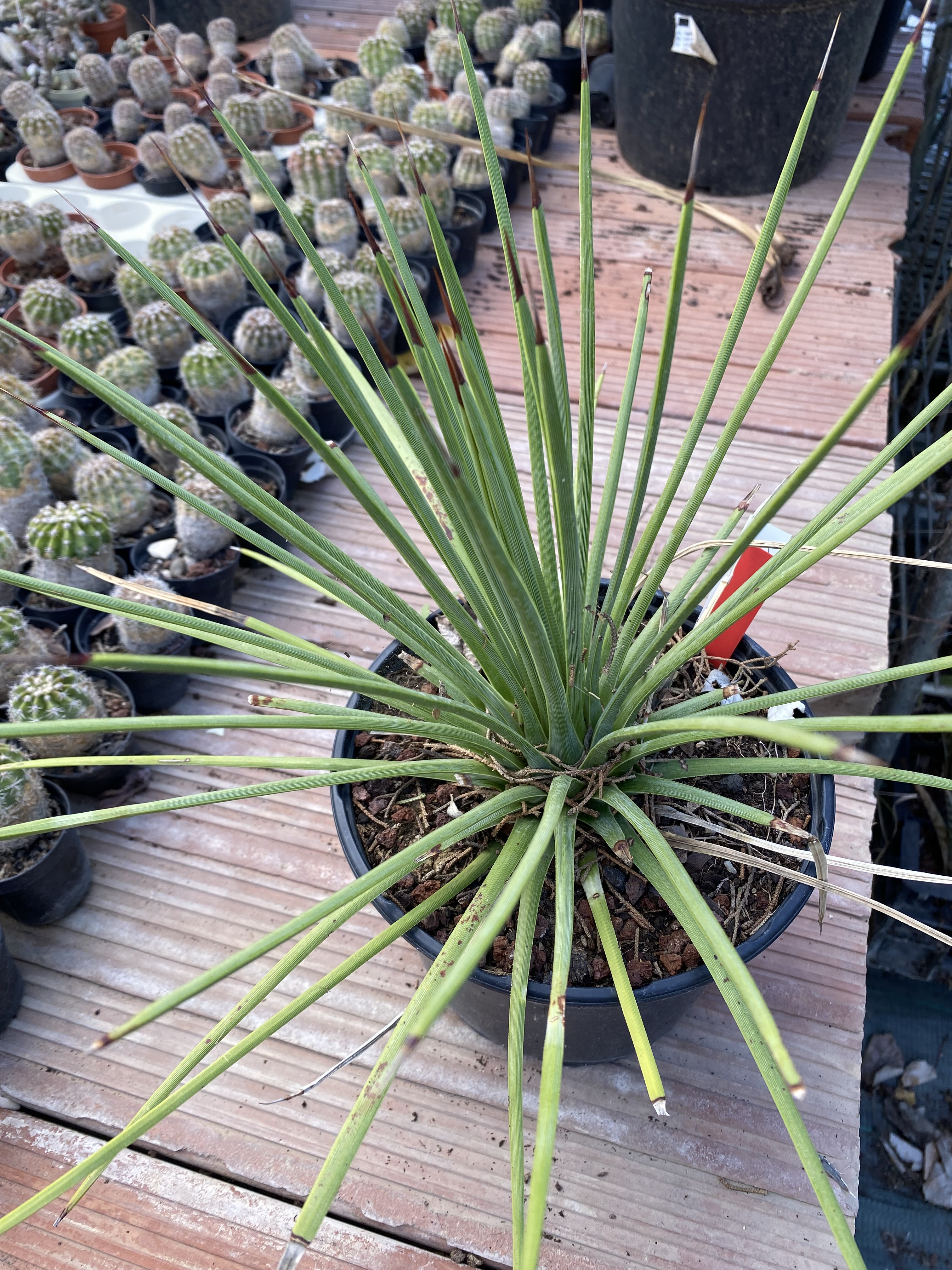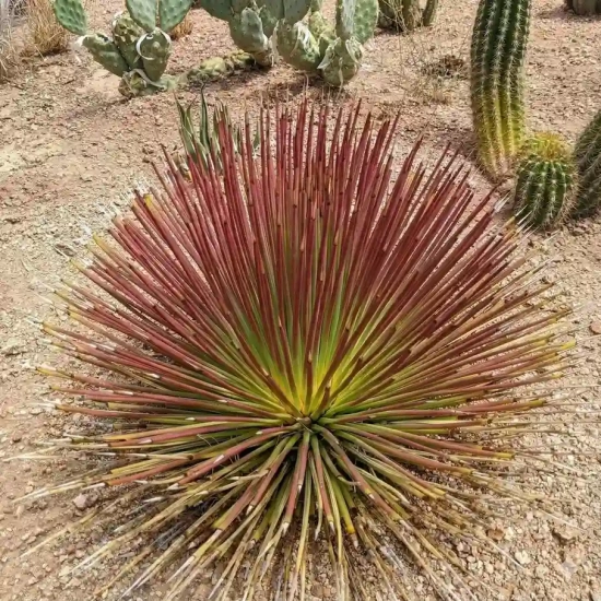 Rubra (Agave striata 'Rubra') est un petit agave graphique et très architectural, idéal si vous cherchez une plante originale, très résistante à la sécheresse et quasiment sans entretien. Son feuillage fin, rigide et légèrement teinté de rouge forme une boule piquante très décorative, parfaite en pot ou en massif sec. Cette plante fait partie des agaves les plus adaptés aux jardins secs et à la culture en pot, à découvrir dans la sélection d’agaves de la pépinière.