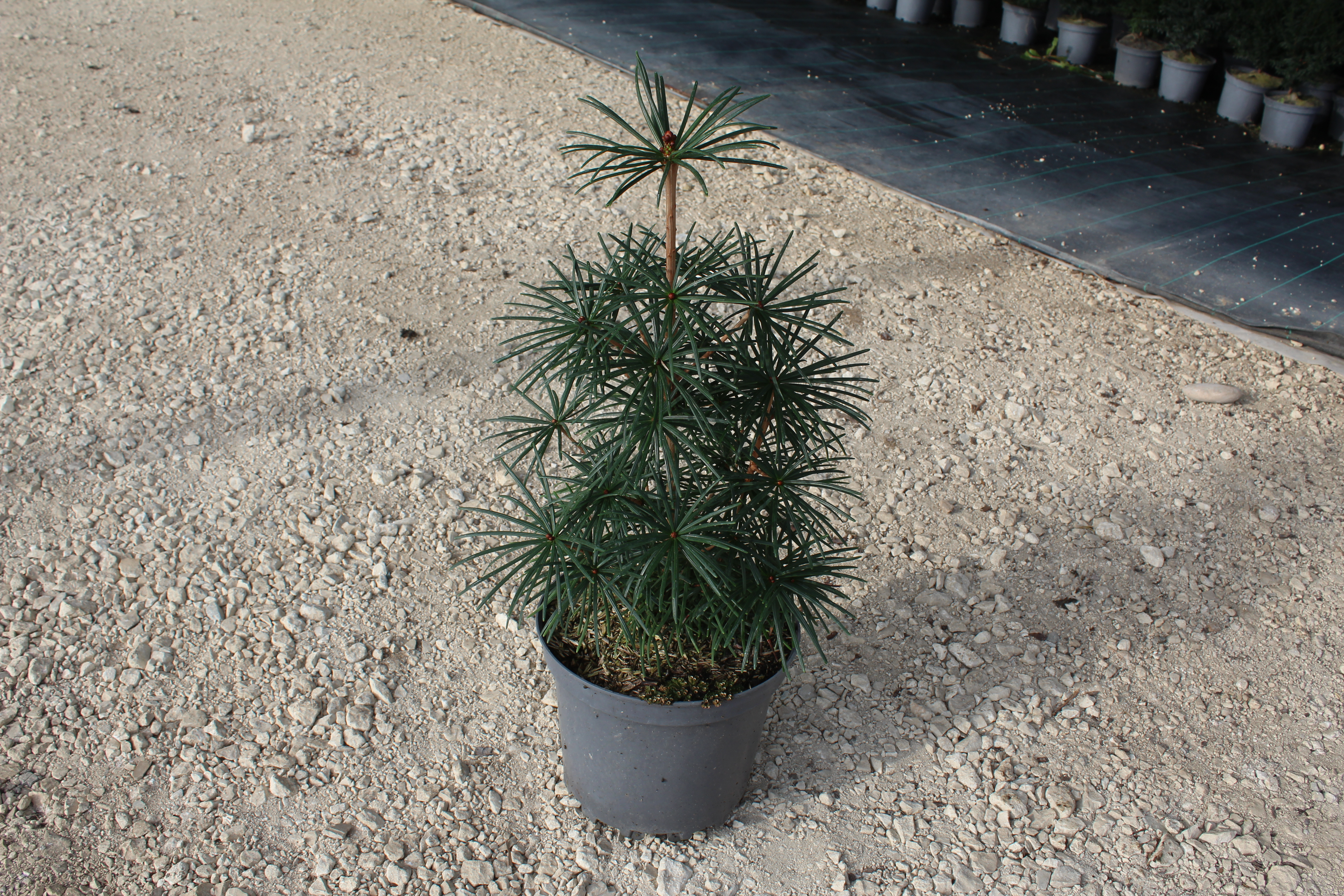 Il doit son nom à ses aiguilles uniques au monde : épaisses, vernissées et vert foncé, elles sont disposées en cercles (verticilles) autour des tiges, ressemblant aux baleines d'un parapluie retourné. Sa croissance lente et son port pyramidal compact en font un bijou pour les jardins zen ou les petits espaces. Voir tous nos Conifères rares et Pins.