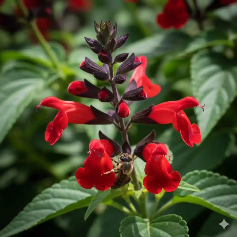 La Sauge 'Royal bumble' mesure généralement entre 60 et 90 cm de hauteur et se caractérise par ses tiges robustes et ses feuilles vertes, légèrement duveteuses. Ses fleurs, de couleur rouge vif, se forment en longues inflorescences qui peuvent atteindre jusqu'à 30 cm de long. La floraison débute au printemps et se prolonge tout l'été, apportant une touche de couleur éclatante au jardin. Les feuilles, quant à elles, dégagent un parfum agréable, ce qui en fait une plante à la fois décorative et aromatique.