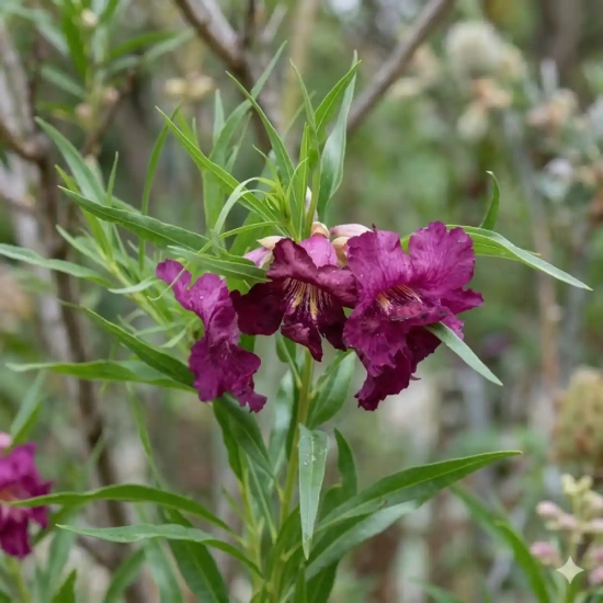 Le Chilopsis linearis 'Burgundy', ou Saule du désert, est un arbuste d'ornement rare et fascinant, plébiscité pour sa silhouette légère et sa floraison exotique. Il se distingue par ses fleurs tubulaires et frangées d'un pourpre violet profond, évoquant la fleur du Catalpa ou de l'Orchidée. Son feuillage caduc, composé de feuilles très étroites et allongées, apporte une texture vaporeuse et élégante qui ondule au moindre souffle de vent.