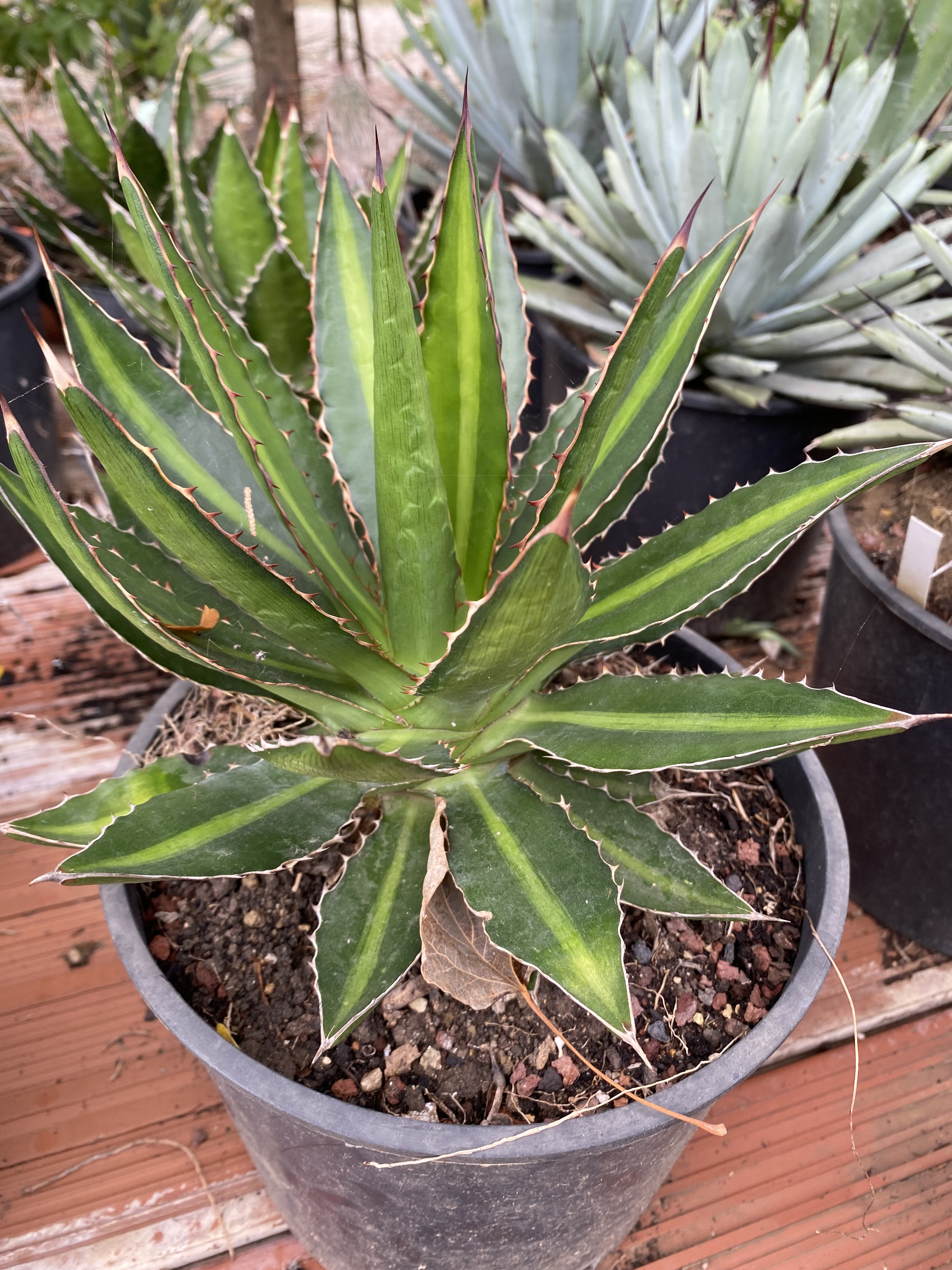 Cet agave se distingue par son allure graphique et très lumineuse, idéale pour donner un accent architectural aux massifs secs, rocailles et potées. Agave lophantha 'Splendida' forme une rosette compacte de feuilles épaisses, rigides, vert foncé largement bordées de jaune crème, très décorative tout au long de l’année.