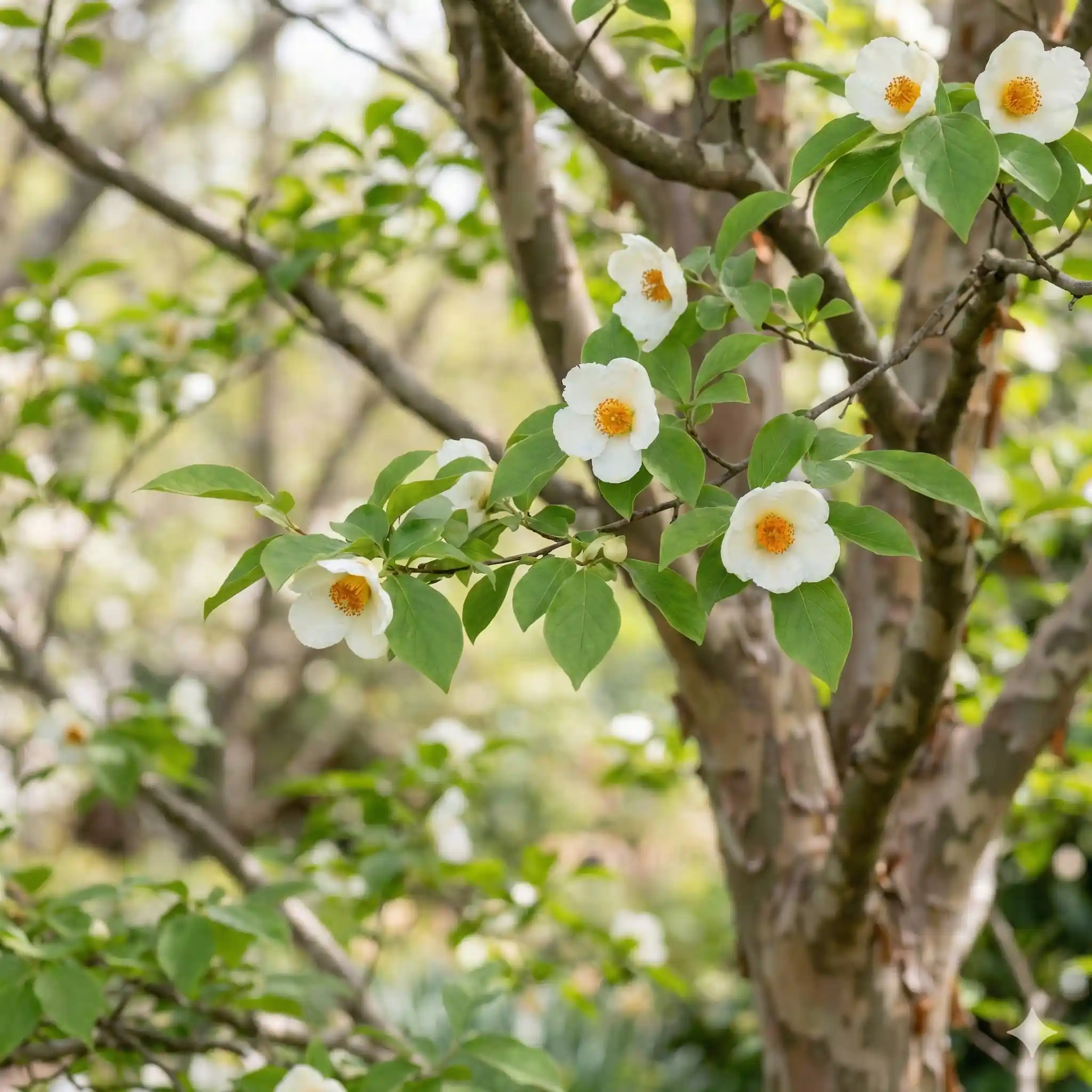 Ses fleurs en coupe, blanches au cœur d'étamines or, rappellent celles du camélia. Son port gracieux et ses feuilles vernissées sont d'ailleurs parfaitement mis en valeur par des visuels au format carré, idéaux pour capturer le détail de sa floraison soyeuse ou les nuances de son écorce marbrée. Voir tous nos Arbres d'Exception.