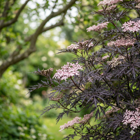 Au début de l'été, il offre un spectacle fascinant avec ses ombelles de fleurs roses parfumées qui se détachent magnifiquement sur son feuillage sombre. Sa silhouette élancée et graphique est d'ailleurs parfaitement adaptée à des visuels au format carré, mettant en valeur sa verticalité exceptionnelle. Voir tous nos Sureaux sur ma-pepiniere.fr.