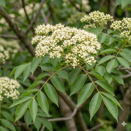 Le Tetradium daniellii, plus connu sous le nom d'Arbre à miel ou Euodia, est un petit arbre ornemental d'une valeur écologique inestimable. Originaire d'Asie, il se distingue par son port étalé et ses grandes feuilles découpées d'un vert sombre luisant. En plein été, il se couvre d'une myriade de corymbes de fleurs blanc crème intensément parfumées. Véritable station-service pour les pollinisateurs, il offre une source de nectar massive au moment où le jardin en a le plus besoin.