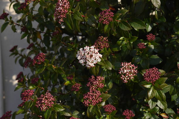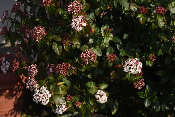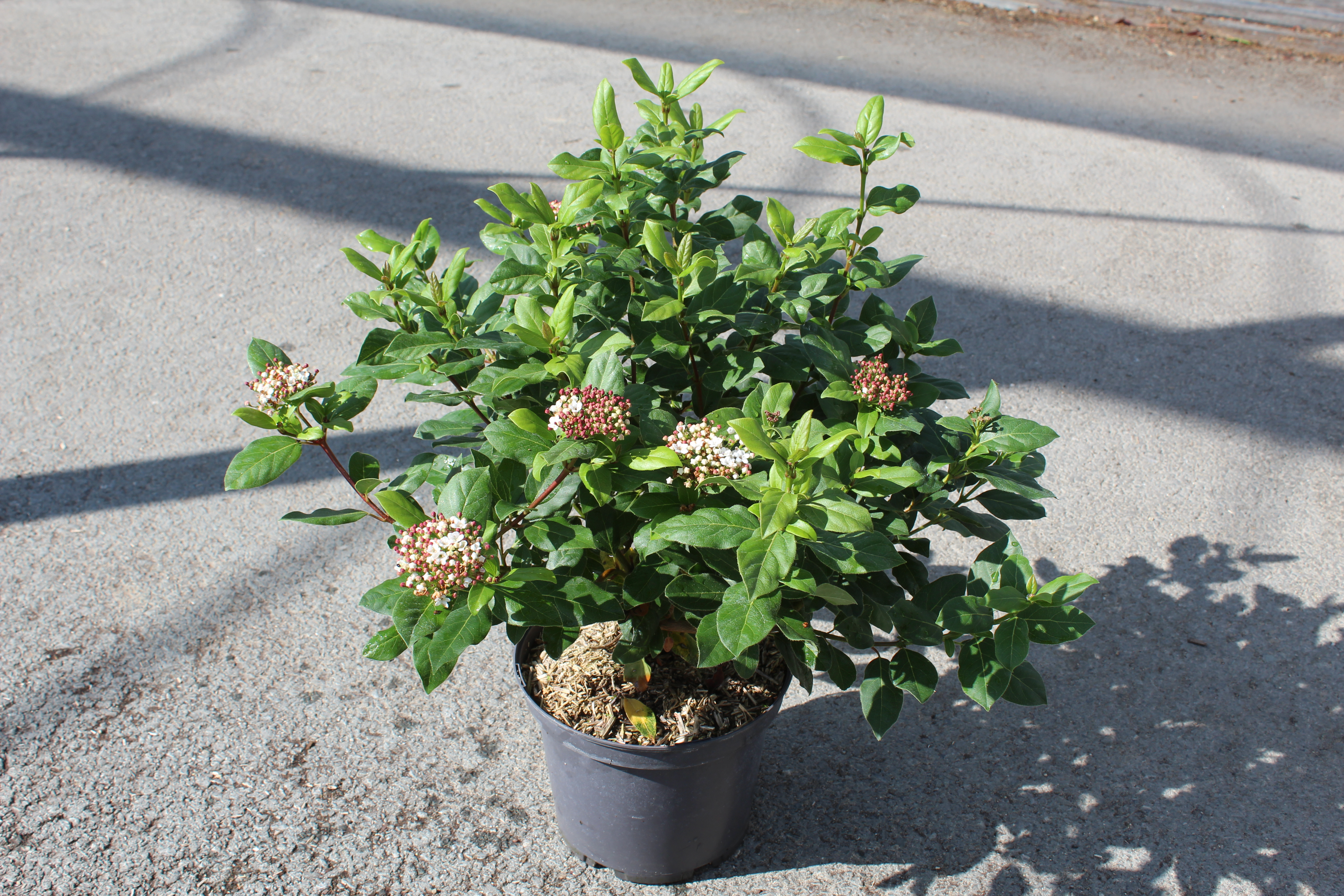 Le Viorne tin 'Gwenllian' se caractérise par un port érigé et buissonnant qui peut atteindre une hauteur de 2,5 à 3 mètres. Ses feuilles, ovales et légèrement dentées, offrent une texture lustrée qui ajoute de l'intérêt visuel, même lorsque les fleurs ne sont pas en pleine floraison. En automne, ces feuilles se teintent de coloris chaleureux, allant du jaune au rouge, ce qui prolonge le temps d'observation des jardiniers.