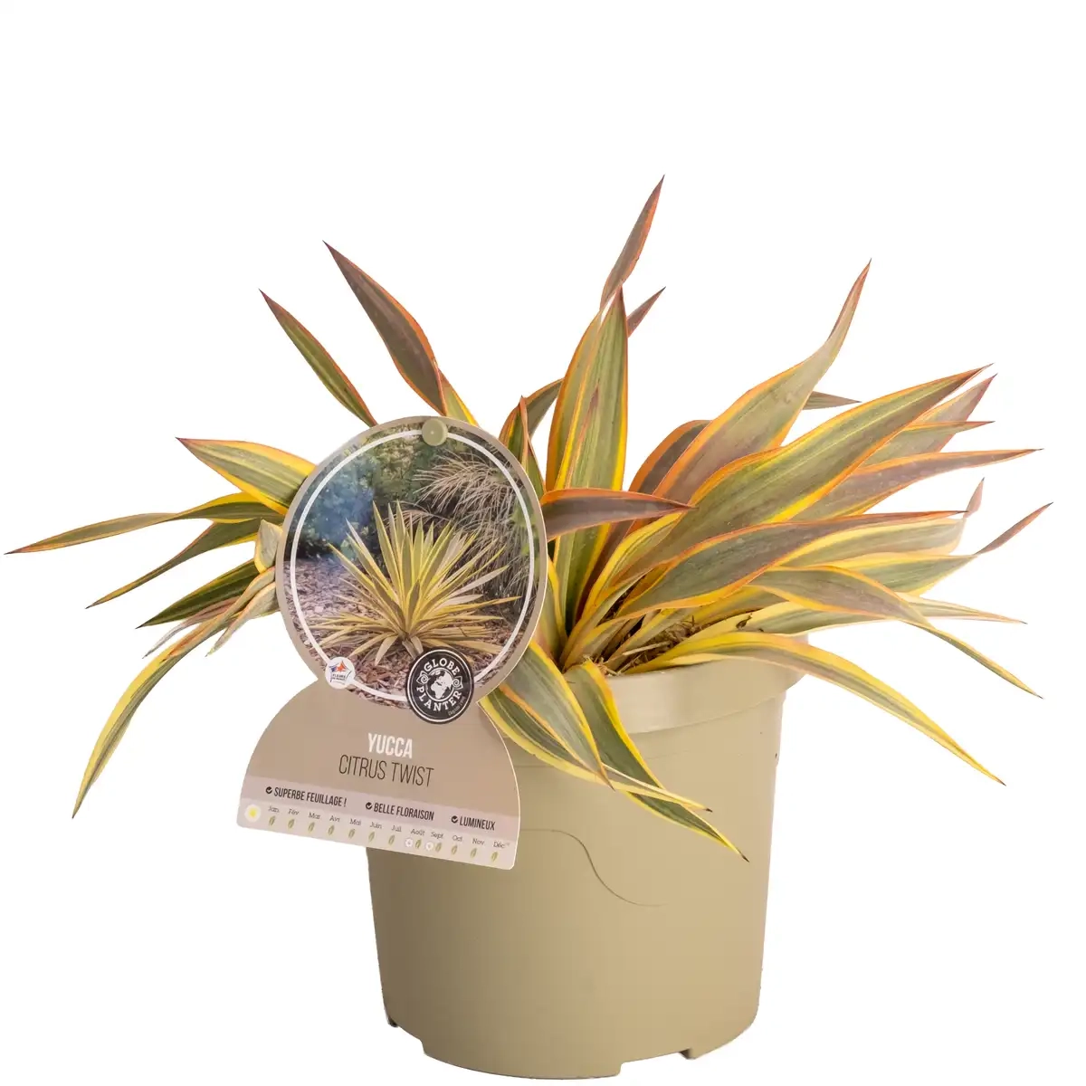 Le Yucca 'Citrus twist' est une plante vivace fascinante, connue pour son port dressé et ses feuilles en rosette, apportant une touche d'exotisme à votre jardin ou à vos espaces de vie intérieure. Avec son feuillage long et étroit, affichant un vert vif relevé de bords crème, cette variété est particulièrement appréciée pour sa résistance et sa beauté graphique. Originaire d'Amérique centrale et des États-Unis, elle est idéale pour des aménagements paysagers méditerranéens ou tropicaux. Voir tous nos Autres Yucca