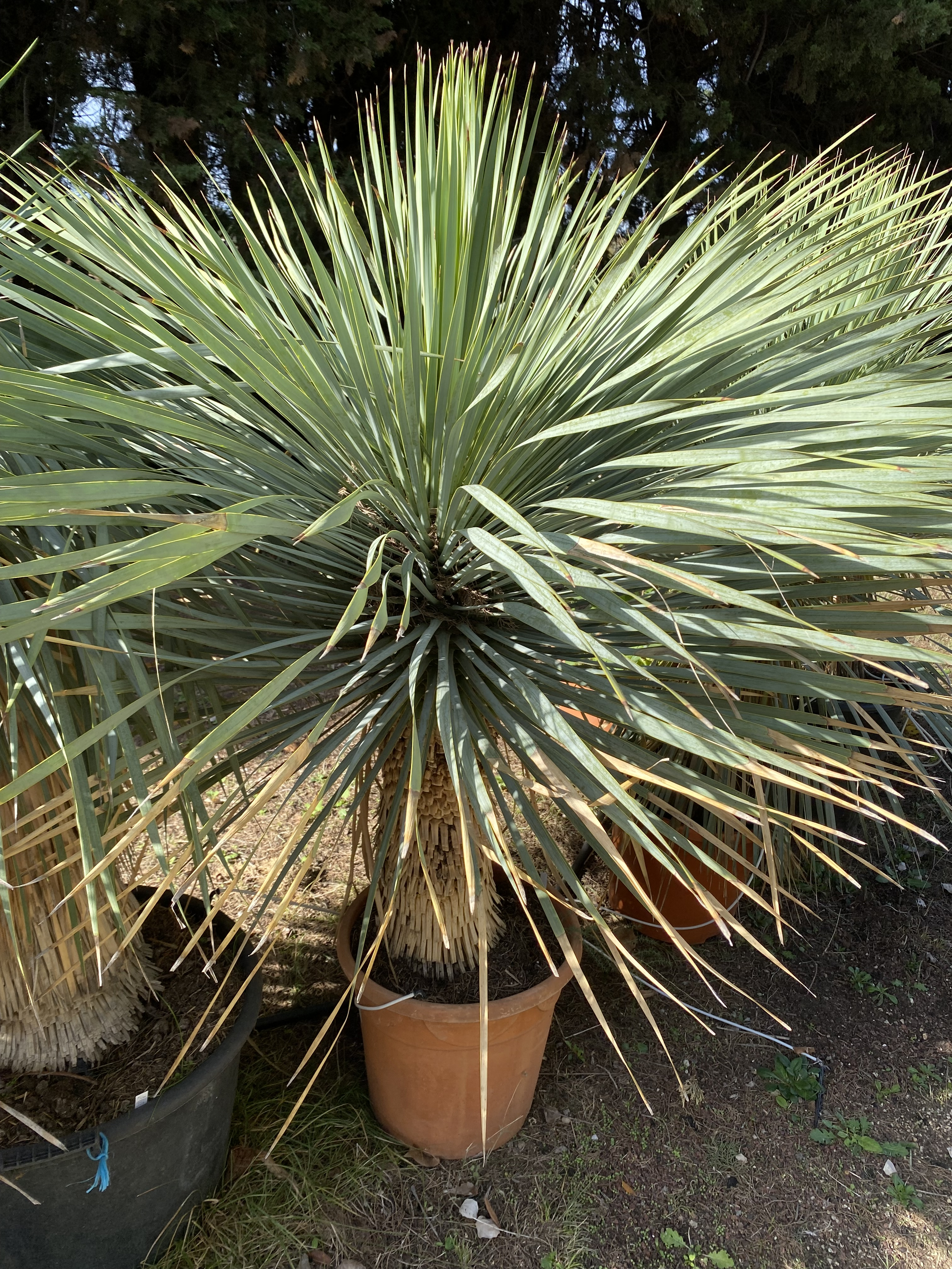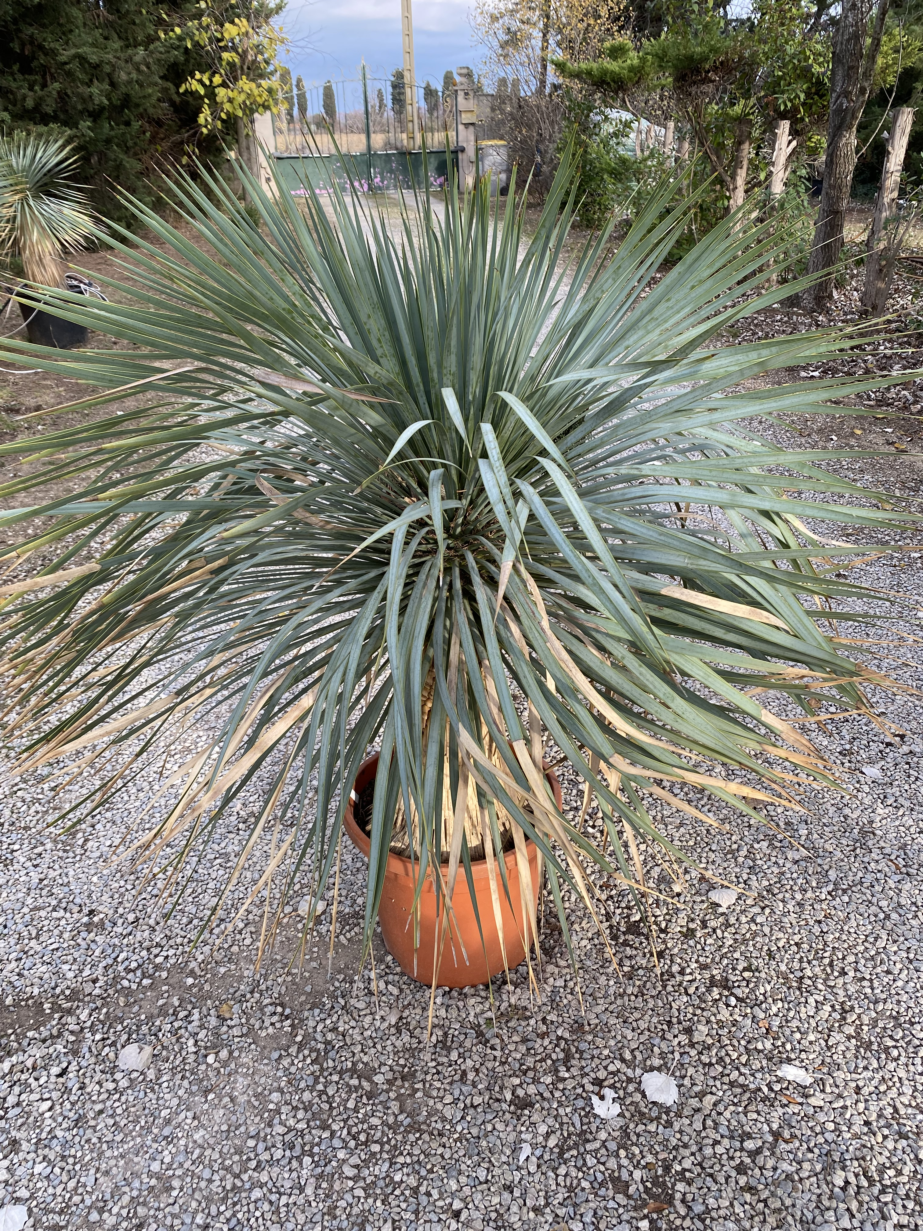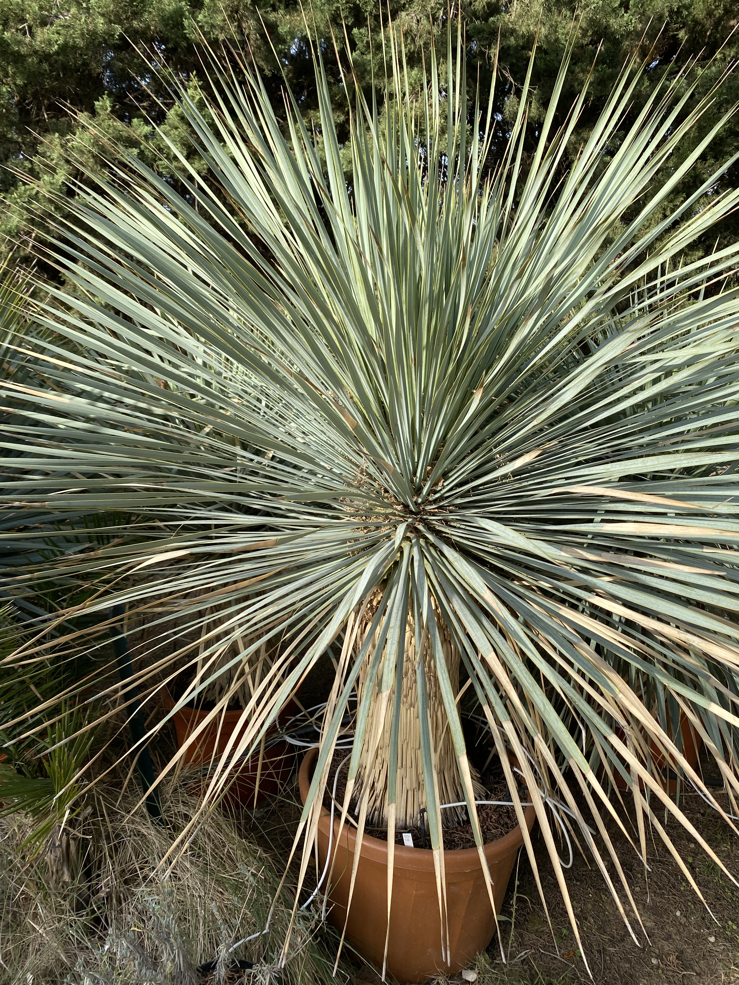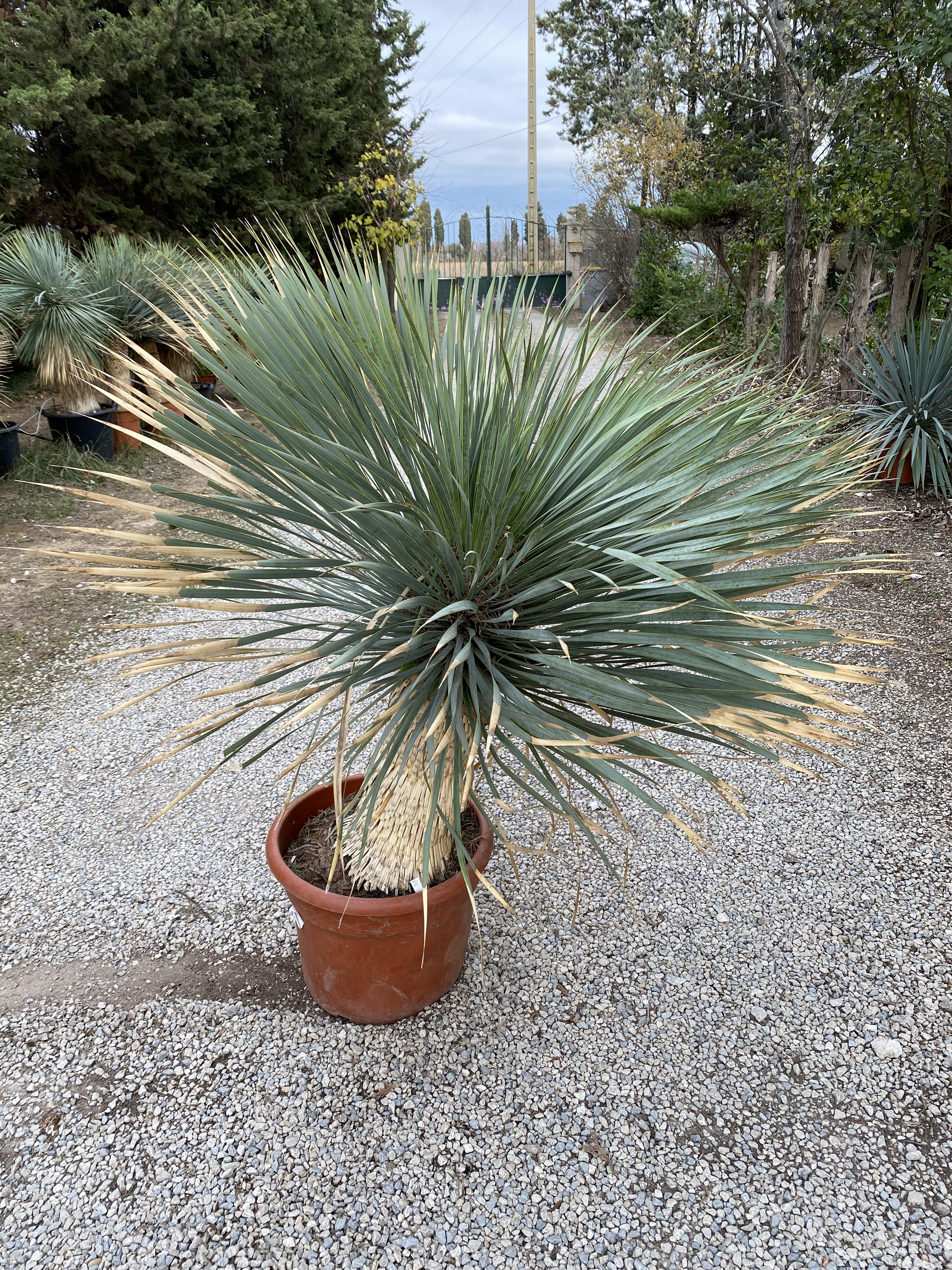 Le Yucca rostrata, souvent appelé "Yucca à bec" ou "Yucca bleu", est l'une des plantes arborescentes les plus graphiques et convoitées pour les jardins contemporains, secs ou d'inspiration méditerranéenne. Originaire des zones désertiques du Mexique et du Texas, il développe avec l'âge un tronc (stipe) dressé, couronné par une rosette sphérique et dense. Sa silhouette unique de "pompon bleuté" et sa couleur froide très décorative toute l'année en font un point focal spectaculaire. Découvrez notre collection complète de Yuccas sur ma-pepiniere.fr.